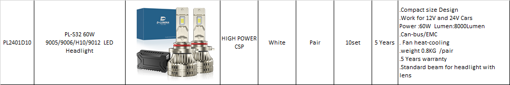 .Compact size Design .Work for 12V and 24V Cars Power :60W Lumen:8000Lumen .Can-bus/EMC . Fan heat-cooling .weight 0.8KG /pair .5 Years warranty .Standard beam for headlight with lens