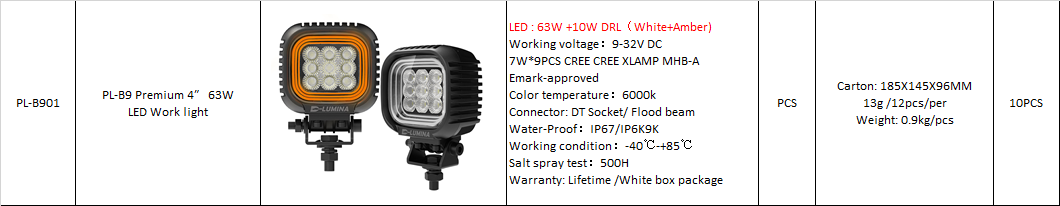 LED : 63W +10W DRL(White+Amber) Working voltage:9-32V DC