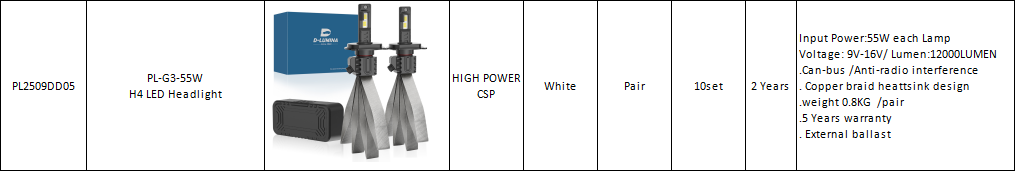 Input Power:55W each Lamp Voltage: 9V-16V/ Lumen:12000LUMEN .Can-bus /Anti-radio interference . Copper braid heattsink design .weight 0.8KG /pair .5 Years warranty . External ballast