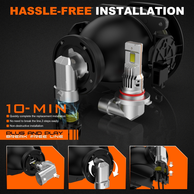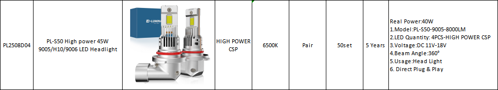Real Power:40W 1.Model:PL-S50-9005-8000LM 2.LED Quantity: 4PCS-HIGH POWER CSP 3.Voltage:DC 11V-18V 4.Beam Angle:360° 5.Usage:Head Light 6. Direct Plug &