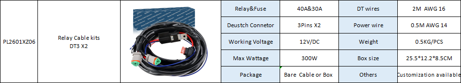 Relay&Fuse 40A&30A DT wires 2M AWG 16 Deustch Connetor 3Pins X2 Power wire 0.5M AWG 14 Working Voltage 12V/DC Weight 0.5KG/PCS Max Wattage 300W Box size 25.5*12.2*8.5CM Package Bare Cable or Box Others Customization available