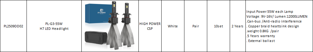 Input Power:55W each Lamp Voltage: 9V-16V/ Lumen:12000LUMEN .Can-bus /Anti-radio interference . Copper braid heattsink design .weight 0.8KG /pair .5 Years warranty . External ballast