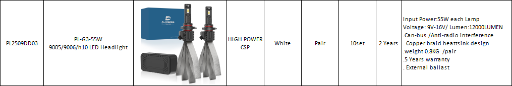 Input Power:55W each Lamp Voltage: 9V-16V/ Lumen:12000LUMEN .Can-bus /Anti-radio interference . Copper braid heattsink design .weight 0.8KG /pair .5 Years warranty . External ballast