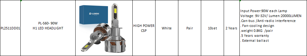 Input Power:90W each Lamp Voltage: 9V-32V/ Lumen:20000LUMEN .Can-bus /Anti-radio interference . Fan-cooling design .weight 0.8KG /pair .5 Years warranty . External ballast