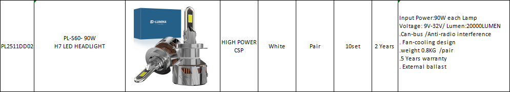 Input Power:90W each Lamp Voltage: 9V-32V/ Lumen:20000LUMEN .Can-bus /Anti-radio interference . Fan-cooling design .weight 0.8KG /pair .5 Years warranty . External ballast