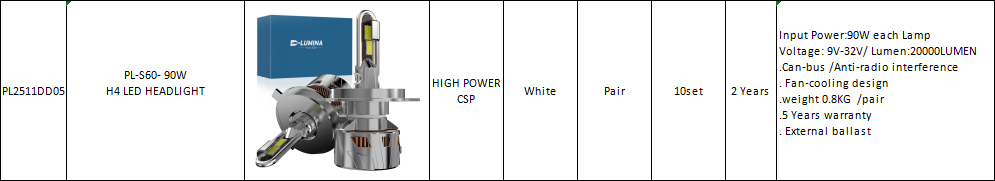Input Power:90W each Lamp Voltage: 9V-32V/ Lumen:20000LUMEN .Can-bus /Anti-radio interference . Fan-cooling design .weight 0.8KG /pair .5 Years warranty . External ballast