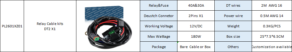 Relay&Fuse 40A&30A DT wires 2M AWG 16 Deustch Connetor 2Pins X1 Power wire 0.5M AWG 14 Working Voltage 12V/DC Weight 0.3KG/PCS Max Wattage 180W Box size 25*7.5*6.5CM Package Bare Cable or Box Others Customization available