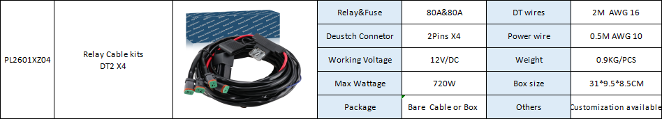 Relay&Fuse 80A&80A DT wires 2M AWG 16 Deustch Connetor 2Pins X4 Power wire 0.5M AWG 10 Working Voltage 12V/DC Weight 0.9KG/PCS Max Wattage 720W Box size 31*9.5*8.5CM Package Bare Cable or Box Others Customization available