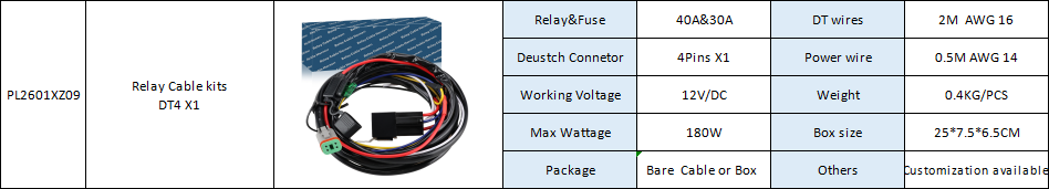 Relay&Fuse 40A&30A DT wires 2M AWG 16 Deustch Connetor 4Pins X1 Power wire 0.5M AWG 14 Working Voltage 12V/DC Weight 0.4KG/PCS Max Wattage 180W Box size 25*7.5*6.5CM Package Bare Cable or Box Others Customization available