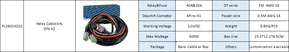 Relay&Fuse 40A&30A DT wires 2M AWG 16 Deustch Connetor 4Pins X1 Power wire 0.5M AWG 14 Working Voltage 12V/DC Weight 0.6KG/PCS Max Wattage 300W Box size 25.5*12.2*8.5CM Package Bare Cable or Box Others Customization available