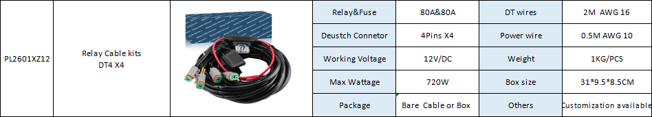 Relay&Fuse 80A&80A DT wires 2M AWG 16 Deustch Connetor 4Pins X4 Power wire 0.5M AWG 10 Working Voltage 12V/DC Weight 1KG/PCS Max Wattage 720W Box size 31*9.5*8.5CM Package Bare Cable or Box Others Customization available