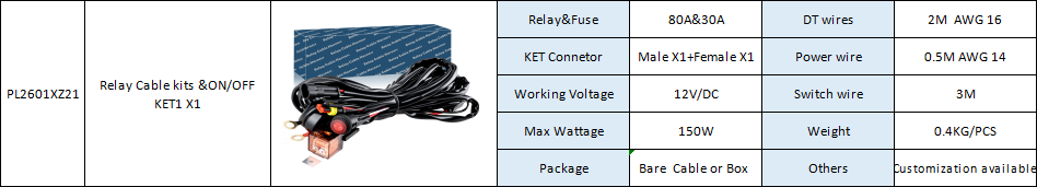 Relay&Fuse 80A&30A DT wires 2M AWG 16 KET Connetor Male X1+Female X1 Power wire 0.5M AWG 14 Working Voltage 12V/DC Switch wire 3M Max Wattage 150W Weight 0.4KG/PCS Package Bare Cable or Box Others Customization available