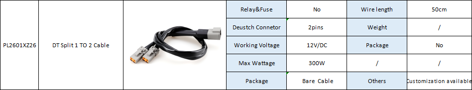 Relay&Fuse No Wire length 50cm Deustch Connetor 2pins Weight / Working Voltage 12V/DC Package No Max Wattage 300W / / Package Bare Cable Others Customization available