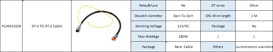 Relay&Fuse No DT wires 50cm Deustch Connetor 3pin To 2pin DRL Wire length 1 M Working Voltage 12V/DC Package No Max Wattage 180W / / Package Bare Cable Others Customization available