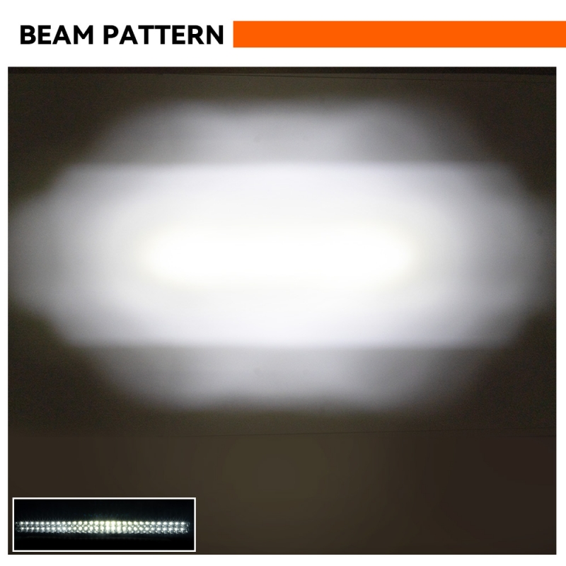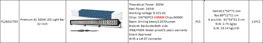 Theoretical Power: 300W Real Power: 165W Working voltage: 9-32V DC Chips: 5W*60PCS OSRAM Chips/6000k Beam: Driving beam/11970Lumen Brakcet: Backside+Both side IP68/IP69K Water-proof/5 years warranty Emark Approved With a set DT connector
