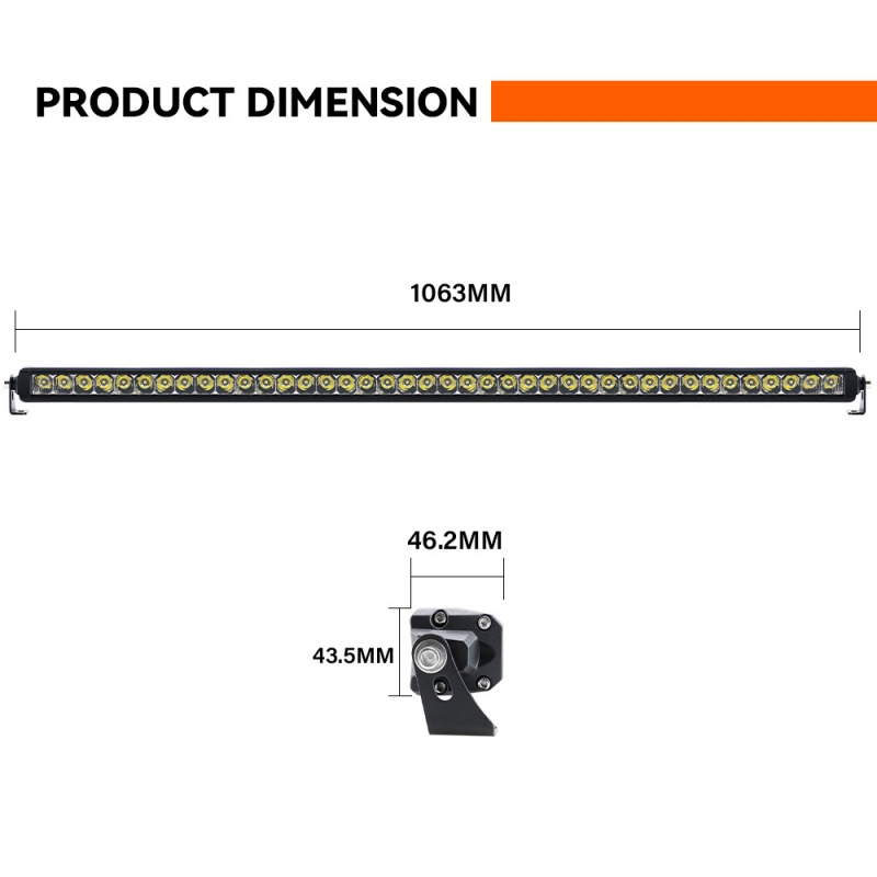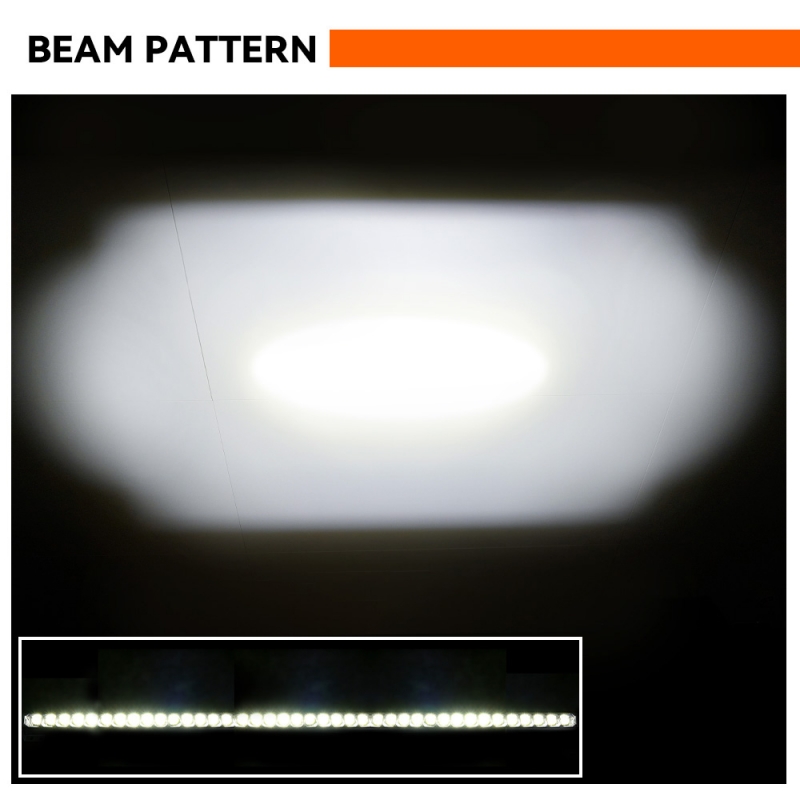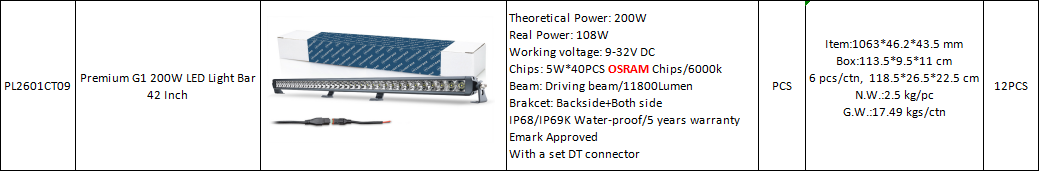 Theoretical Power: 200W Real Power: 108W Working voltage: 9-32V DC Chips: 5W*40PCS OSRAM Chips/6000k Beam: Driving beam/11800Lumen Brakcet: Backside+Both side IP68/IP69K Water-proof/5 years warranty Emark Approved With a set DT connector