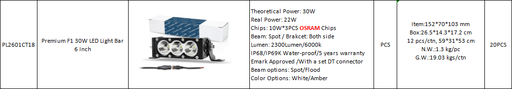 Theoretical Power: 30W Real Power: 22W Chips: 10W*3PCS OSRAM Chips Beam: Spot / Brakcet: Both side Lumen: 2300Lumen/6000k IP68/IP69K Water-proof/5 years warranty Emark Approved /With a set DT connector Beam options: Spot/Flood Color Options: