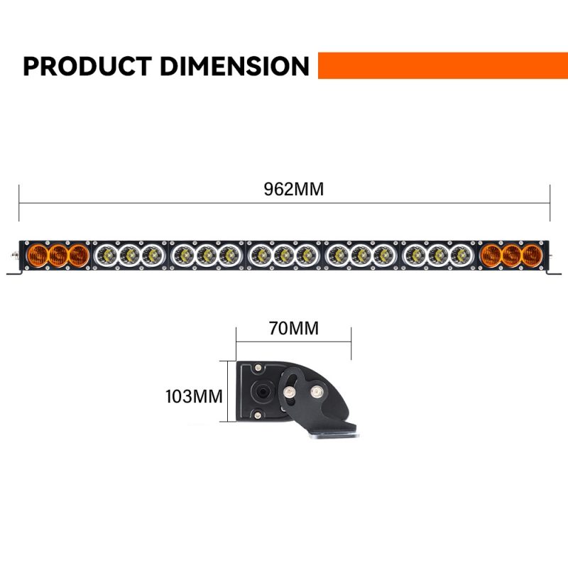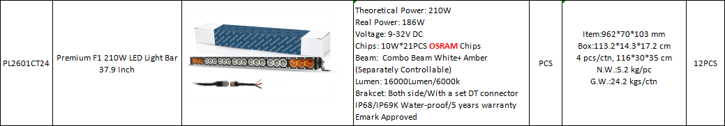Theoretical Power: 210W Real Power: 186W Voltage: 9-32V DC Chips: 10W*21PCS OSRAM Chips Beam: Combo Beam White+ Amber (Separately Controllable) Lumen: 16000Lumen/6000k Brakcet: Both side/With a set DT connector IP68/IP69K Water-proof/5 ye