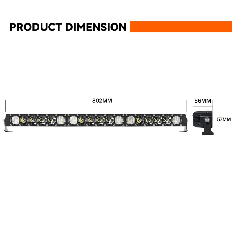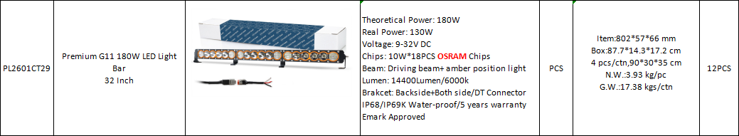 Theoretical Power: 180W Real Power: 130W Voltage: 9-32V DC Chips: 10W*18PCS OSRAM Chips Beam: Driving beam+ amber position light Lumen: 14400Lumen/6000k Brakcet: Backside+Both side/DT Connector IP68/IP69K Water-proof/5 years warranty Emark